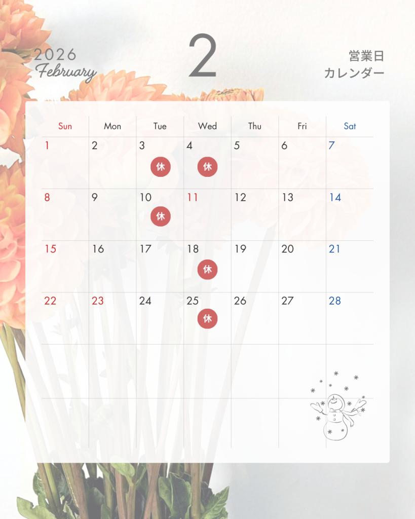 皆さんこんにちは⛄いつも当ブログをご覧いただき誠にありがとうございます🥰📢2月定休日のご案内です。📢2月11日(水)は祝日の為特別営業となります。皆さまの...